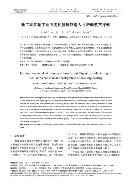 封志明,郑亮,费凌,蔡长韬,马飞达.新工科背景下地方高校智能制造人才培养改革探索[J].实验技术与管理,2021,38(07):23-29+35.
